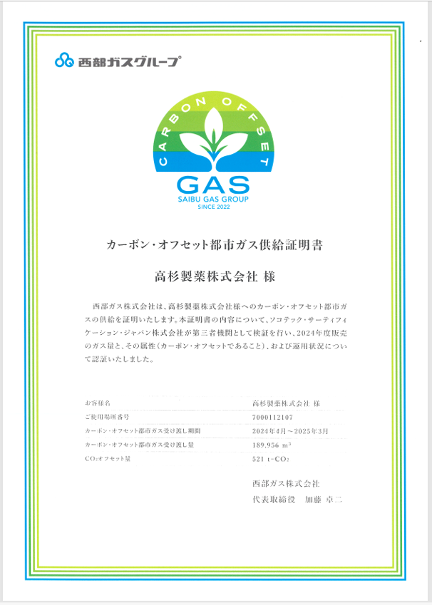 当社では生産工場で使用する都市ガスとして、契約先のガス会社(西部ガス株式会社)が提供するカーボン・オフセット都市ガスを導入いたしました。